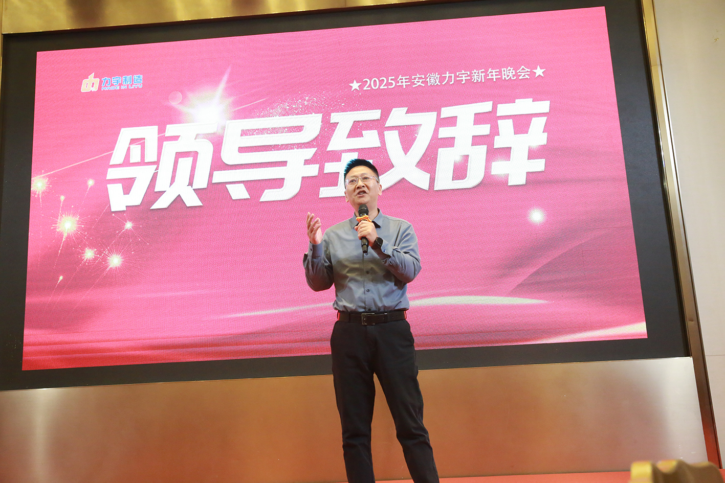 董事长李陆先生上台致辞,首先回顾了公司2024年的发展历程,肯定了2024年所取得的辉煌成绩,力宇一步一个脚印,一年一个新高度,相信2025年公司必将再上一个新的台阶。最后向全体员工致新年贺词,表达了对力宇员工的深切关怀以及对公司发展的期许。